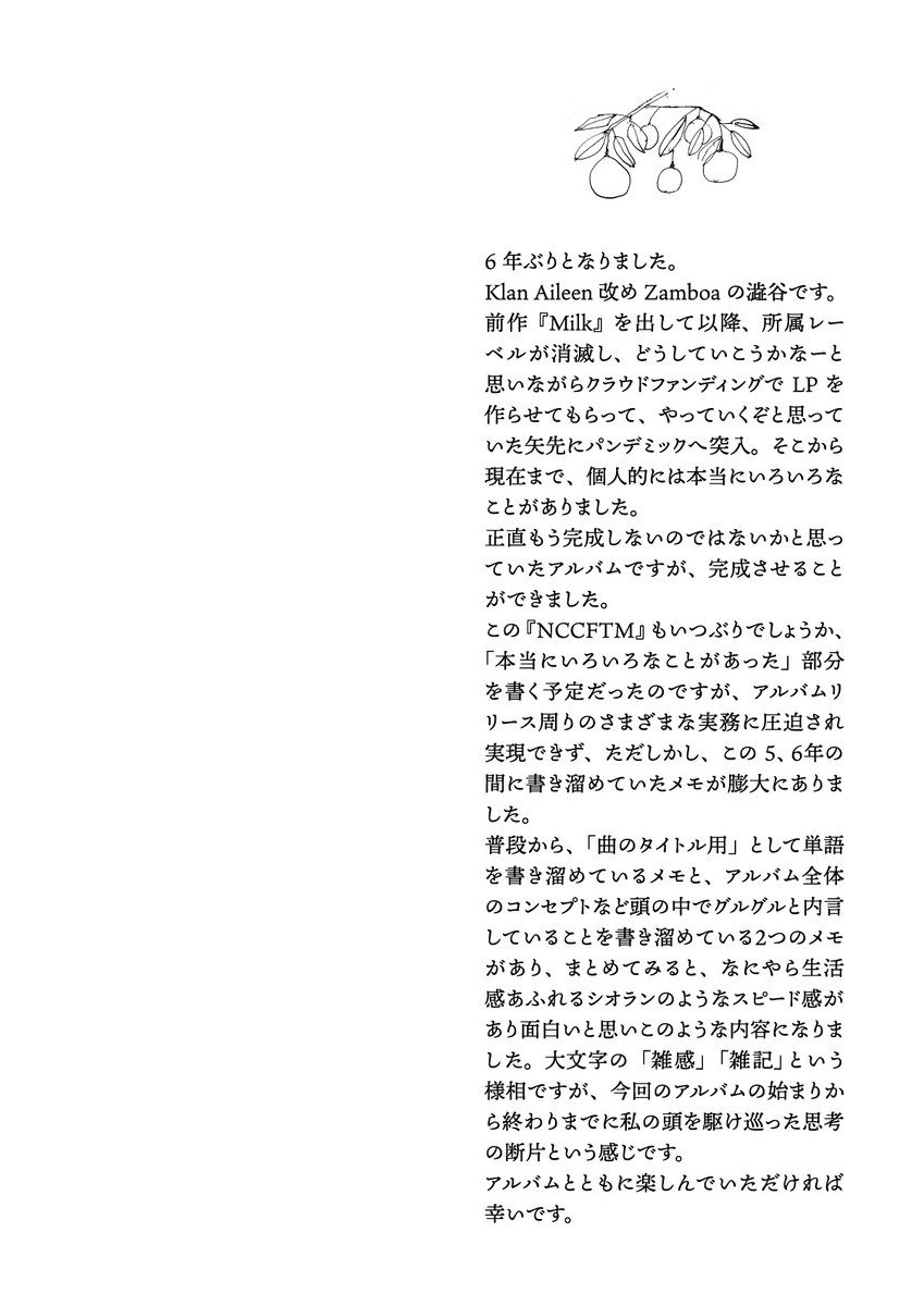 Zamboa(ex.Klan Aileen)の澁谷が不定期発行するZine「NCCFTM」の第9号。 最新作『未来』製作中のあらゆる思索を書き出した断章集。 16P。